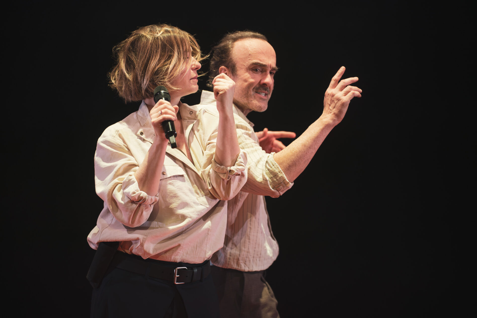 C’est noir, souvent, on se demande si c’est vraiment ça la vie à deux. D’autant qu’avec un micro qu’ils saisissent pour bien marquer la césure, les comédiens nous font entrer sans s’essuyer les pieds dans l’intimité des pensées de leurs personnages. L’un comme l’autre sont désemparés face aux incompréhensions, Doudou est un peu chiant certes, mais peut-être est-il juste un écorché, un mec trop sensible.