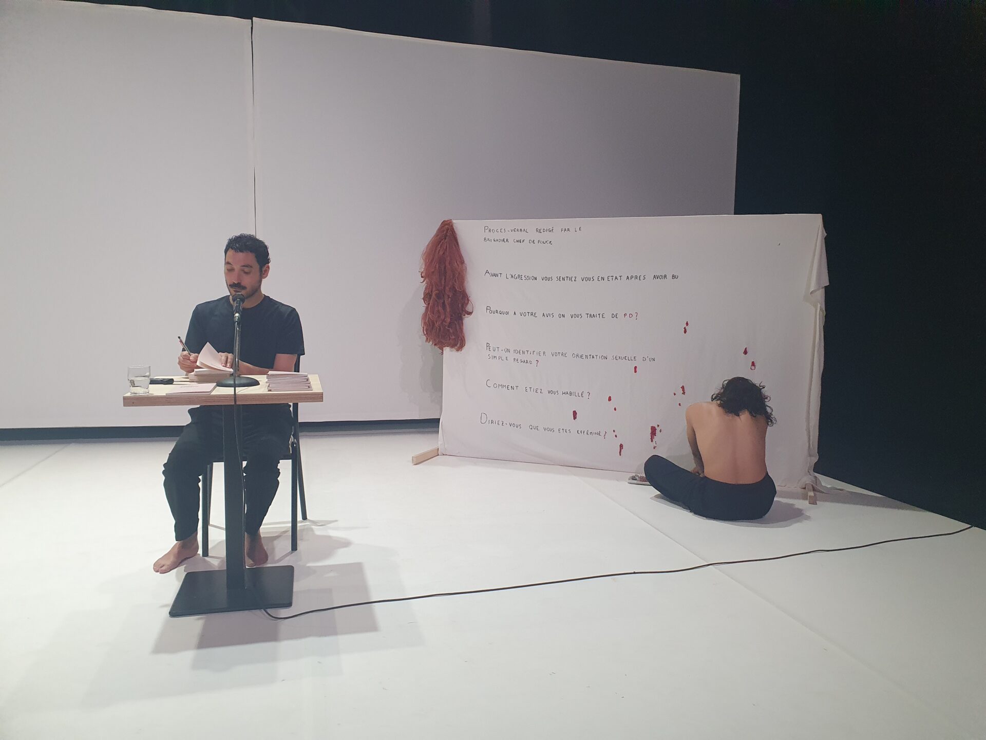 Au fil des représentations, la broderie déployée sur scène se fait plus imbibée de perles de sang, plus explicite avec des phrases entendues il y a 5 ans au commissariat. D’une agression homophobe particulièrement violente en 2020, -Yacine et son compagnon Benjamin en garderont les stigmates à vie-, est né ce triptyque, écrit et interprété par ce spécimen très singulier de la race humaine qui embrasse le monde à travers sa propre histoire.